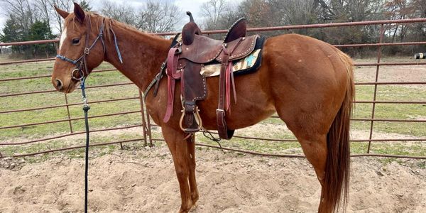 Luna is a grade quarter horse mare standing about 15.1 hands. She has been used to youth rodeo the past year and is that perfect babysitter type. She is more whoa than go when just riding around and super easy walk/trot but can ask for more speed. She is ready to go teach her new rider the barrel and rodeo ropes!